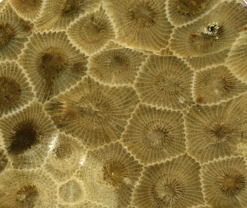 Hexagonaria percarinata consists of tightly packed, six-sided corallites, which are the skeletons of the once-living organism. At the center of each corallite was the mouth, surrounded by tentacles that were used for gathering food and drawing the food into the mouth. This dark spot, or the eye of the corallite, has been filled with silt or mud that petrified after falling into the openings. Calcite, silica and other minerals have replaced the original soft tissues, called polyps, in each cell.